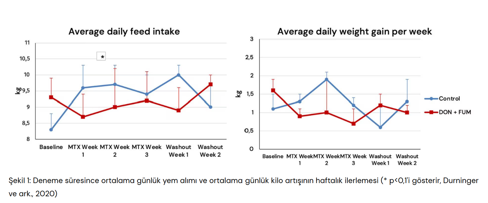 Oregon Eyalet Üniversitesi’nde Duringer (2021) tarafından yürütülen bir çalışmada, iki farklı sığır grubunun diyetleri karşılaştırılmış ve yem alımı üzerindeki etkiler açıkça gözlemlenmiştir (Şekil 1). Çalışma sonuçları, besi öküzlerinin yem alımının kontrol grubundaki hayvanlara kıyasla başlangıçta daha iyi olduğunu göstermiştir. Ancak, mikotoksinlerle muamele edilen hayvanlarda kısa bir süre içinde yem alımı baskılanmıştır. DMI’daki bu azalma, kontrol grubuna kıyasla kilo alımının da belirgin şekilde düşmesine neden olmuştur.