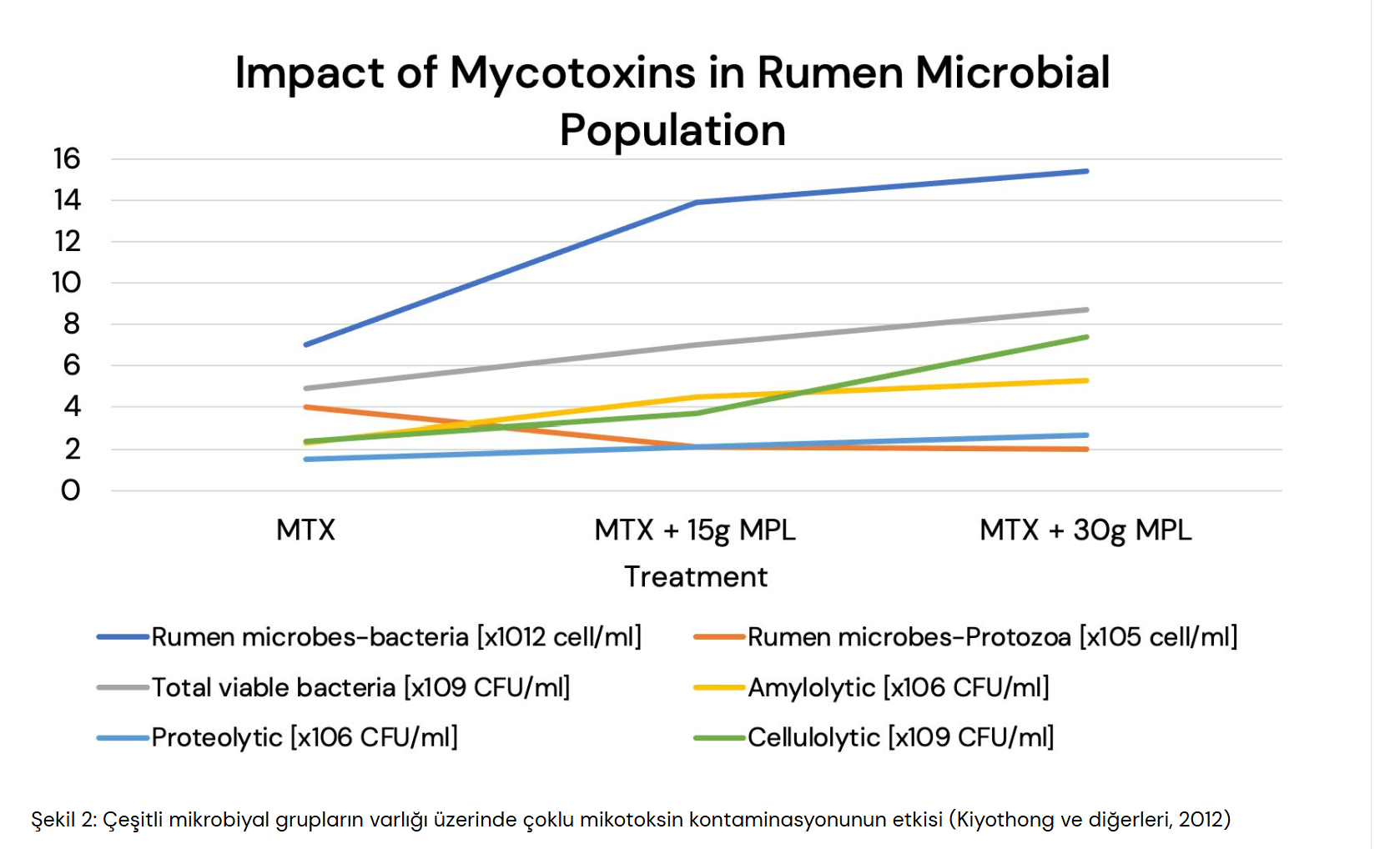 Şekil 2'de, kontrol grubundaki çeşitli mikrobiyal gruplar üzerinde birden fazla mikotoksin kontaminasyonunun etkisi açıkça görülmektedir. Bu kontaminasyon, mikrobiyal aktiviteleri önemli ölçüde azaltmıştır. Ancak, Mycofix® takviyesinin iki farklı dozda uygulanması, mikropları mikotoksinlerin olumsuz etkilerinden korumada etkili olmuştur. Bu koruma sayesinde, mikotoksinlerle kontamine olmuş diyetlere kıyasla mikrobiyal büyüme ve aktivitede belirgin bir iyileşme sağlanmıştır.