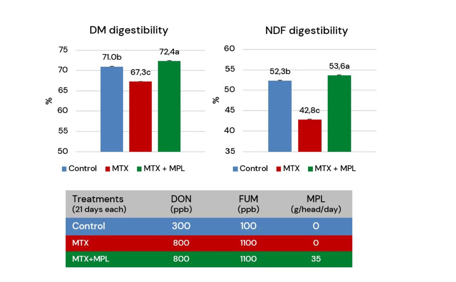 Gallo ve arkadaşları (2021) tarafından yapılan bir çalışmada, yüksek verimli süt ineklerinde nispeten düşük düzeyde deoksinivalenol (DON) ve fumonisin (FUM) kontaminasyonu etkileri incelendi. Çalışma, kuru madde (KM) ve nötr deterjan lifinin (NDF) sindirilebilirliğinin kontaminasyon nedeniyle büyük ölçüde azaldığını ortaya koydu. Ancak, Mycofix®'in koruyucu etkisi sayesinde, sindirilebilirlik seviyeleri kontrol grubunun bile üzerine çıktı (p<0,05). Bu bulgu, mikotoksin kontaminasyonunun düşük seviyelerde dahi olsa etkisiz hale getirilmesinin avantajlı olduğunu göstermektedir.