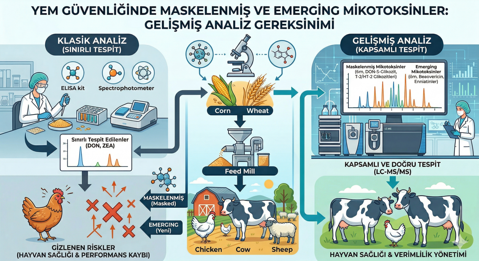 İster beslenme dengesizliklerinden, koinfeksiyonlardan (ör. koksidiyoz), çevresel baskılardan, ister mikotoksin maruziyetinden kaynaklansın NE tek başına hareket etmez,bağırsak strese girdiğinde gelişir. Bu nedenle yalnızca antibiyotiklere ya da genel yem katkılarına güvenmek yeterli değildir; modern kanatlı üretimi proaktif, hassasiyet odaklı bir yaklaşım gerektirir.