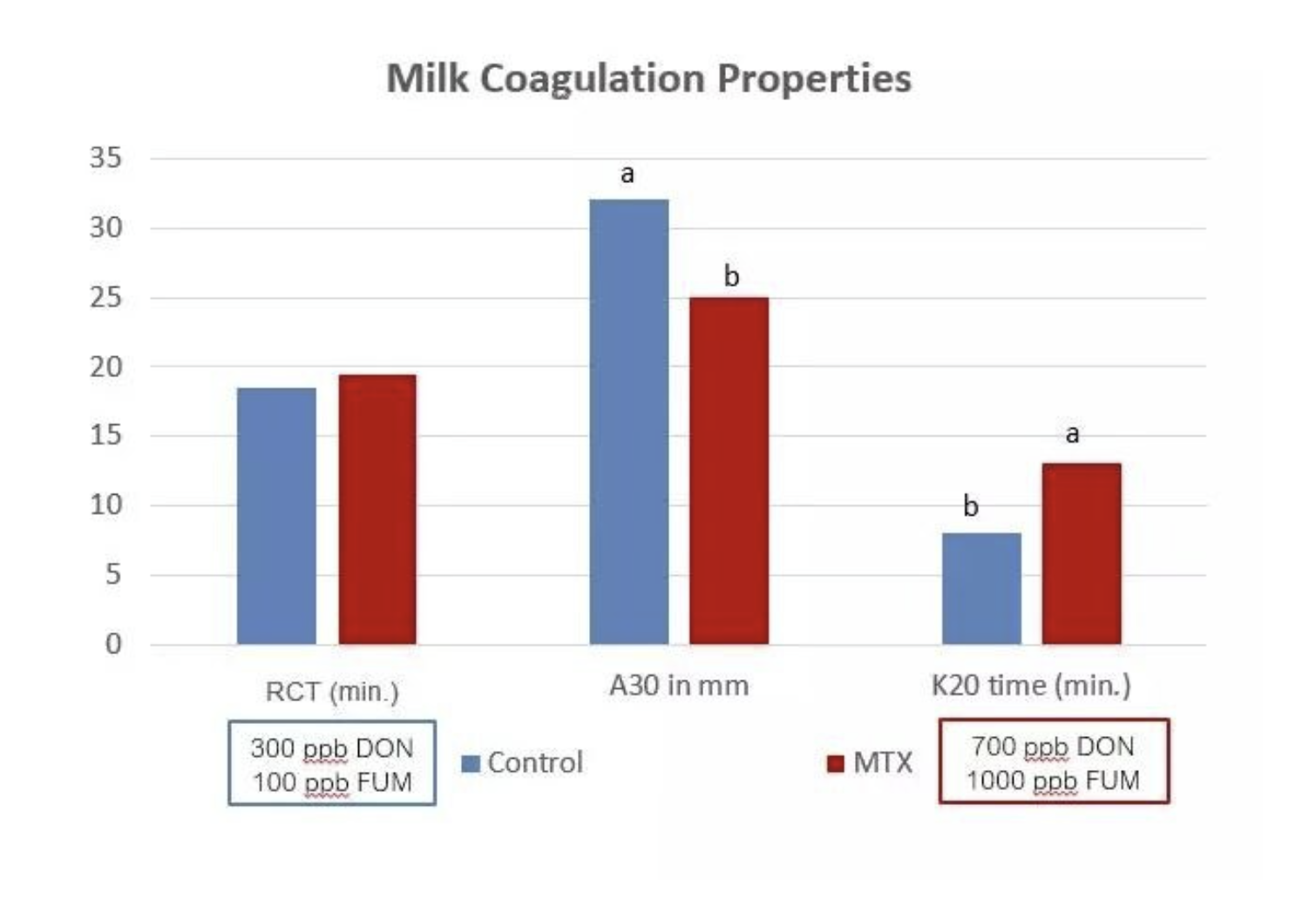 Bilim insanları daha sonra farklı diyetlerle beslenen ineklerin ürettiği sütü karşılaştırdı ve aynı zamanda sütün pıhtılaşma özelliklerine de odaklandı. 20 mm'de (K20) pıhtılaşma sertliğine ulaşma süresi ve 30 dakikada (A30) pıhtılaşma sertliğine ulaşma süresi, daha yüksek düzeyde kontamine diyetle beslenen inek grubunda önemli ölçüde değişti (şekil 1), bu da mikotoksinlerin sütün pıhtılaşması üzerinde önemli bir etkisi olduğunu ortaya koyuyor.
