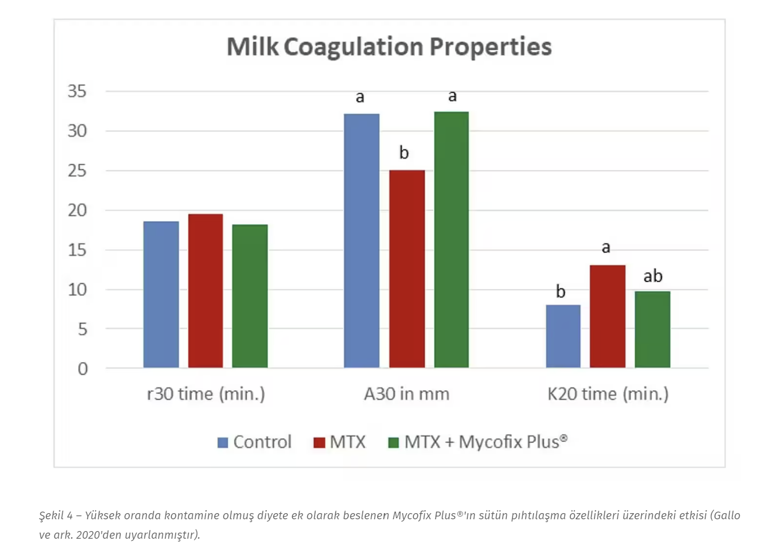 Bu kesinlikle doğru değidirl, en azından Mycofix® için. Mycofix®'in mikotoksinleri hem bağlama hem de biyotransforme etme özelliği sayesinde sütün pıhtılaşması üzerinde de faydalı etkileri vardır. Yukarıda bahsedilen çalışmada, daha yüksek kontamine diyete eklenen Mycofix®, kontrol grubuyla aynı seviyedeki A30 değerlerini geri yükledi (Şekil 4). Bu nedenle, mikotoksinlerle mücadele sadece ineklerin performansı ve sağlığı açısından yararlı olmakla kalmayıp aynı zamanda süt endüstrisi için de olumlu sonuçlar doğurabilir.