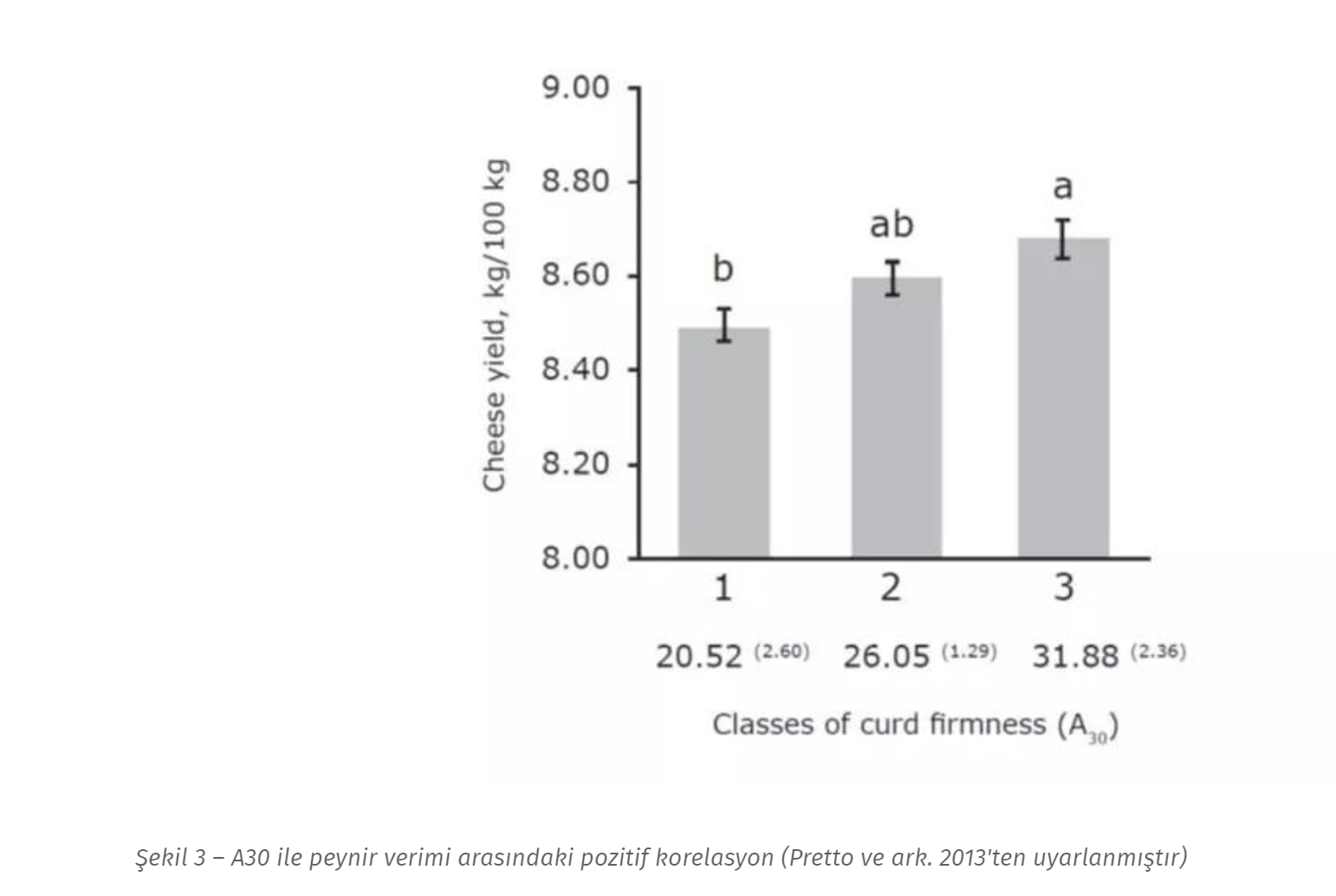 2013 yılında Pretto ve ark . sütün kimyasal ve pıhtılaşma özelliklerinin Grana Padano'nun (popüler bir İtalyan peyniri) peynir verimine etkisini tarla koşullarında değerlendiren bir çalışma yayınladı. Beklendiği gibi süt yağı, protein ve kazein içeriğinin peynir verimiyle yüksek düzeyde ilişkili olduğunu buldular. Ayrıca daha erken pıhtılaşan ve daha güçlü bir A30'a sahip olan süt de daha yüksek verimle ilişkilendirildi (şekil 3). Daha yüksek peynir verimi, birim sıvı süt başına daha fazla peynir üretilmesi anlamına gelir ve bu da daha karlı bir peynir yapım süreci sağlar.