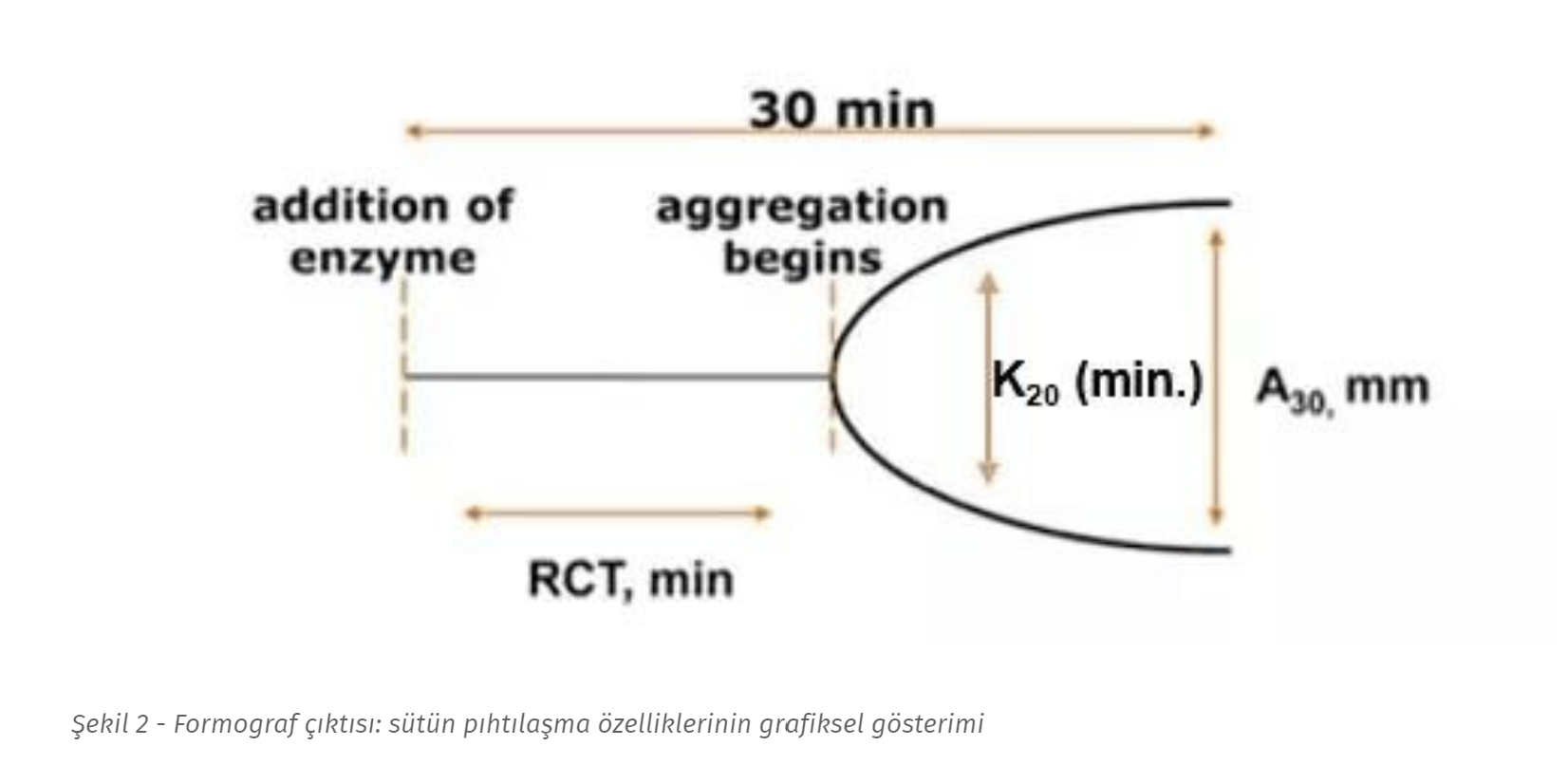 Sütün pıhtılaşma kapasitesini değerlendirmede en yaygın yaklaşım, peynir mayası (enzimler) ilavesini takiben süt numunelerinin viskozitesinin izlenmesidir. Süt endüstrisinde yaygın olarak kullanılan “formograf”, süt kütlesinin zaman içindeki sertliğindeki değişiklikleri kaydeder. Sonuç, karakteristik “Y” şekline sahip bir grafiktir (şekil 2). Genellikle üç parametre belirlenir: