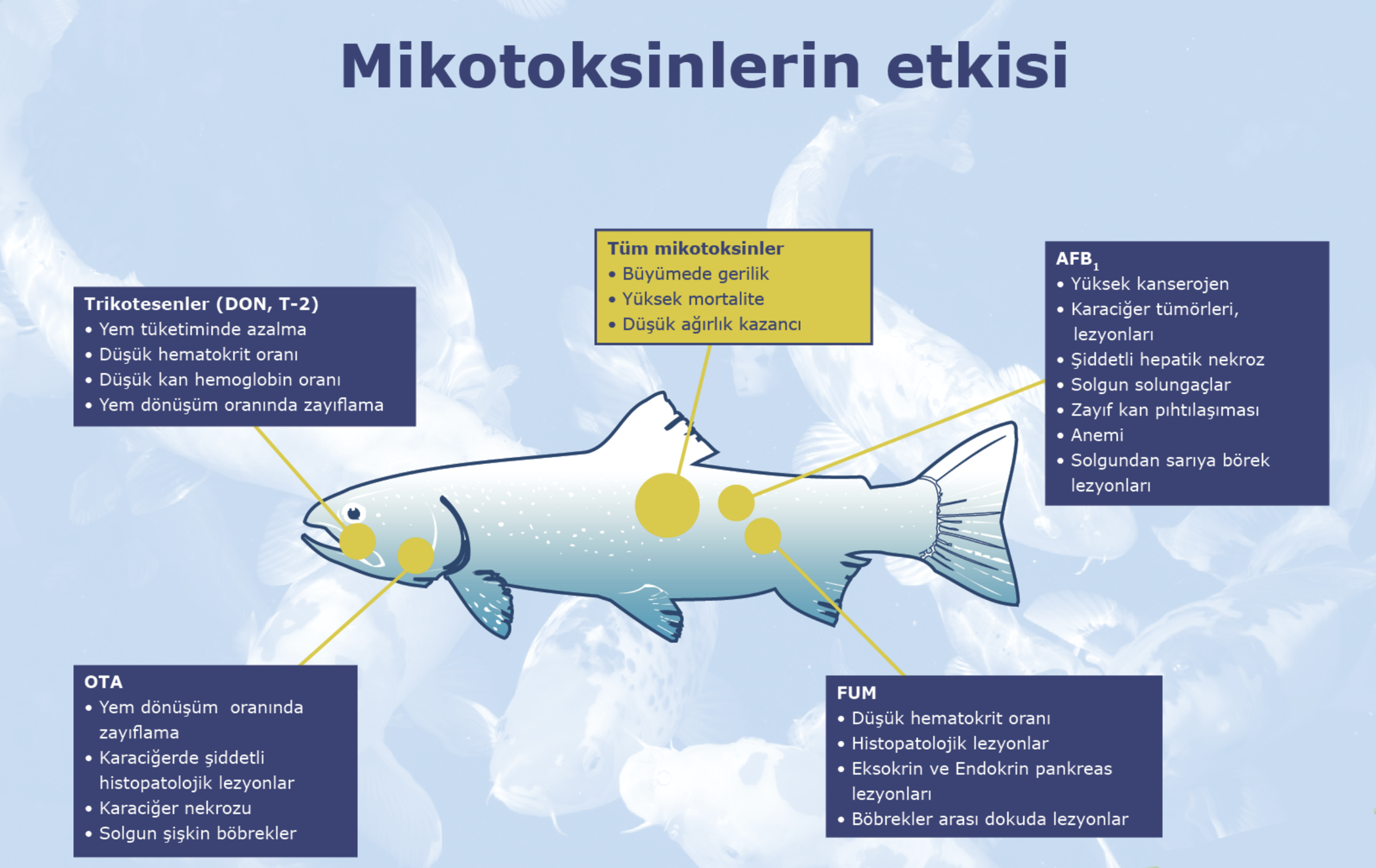 Mikotoksinlerin balık ve karideslerde açıklanan etkilerinin çoğu genel semptomlardır ve örneğin patojenik yük; çevresel stres faktörleri, saponinler, lektinler, tanenler vb. diyet anti-besleme faktörleri gibi çeşitli patolojilere veya zorluklara atfedilebilir.