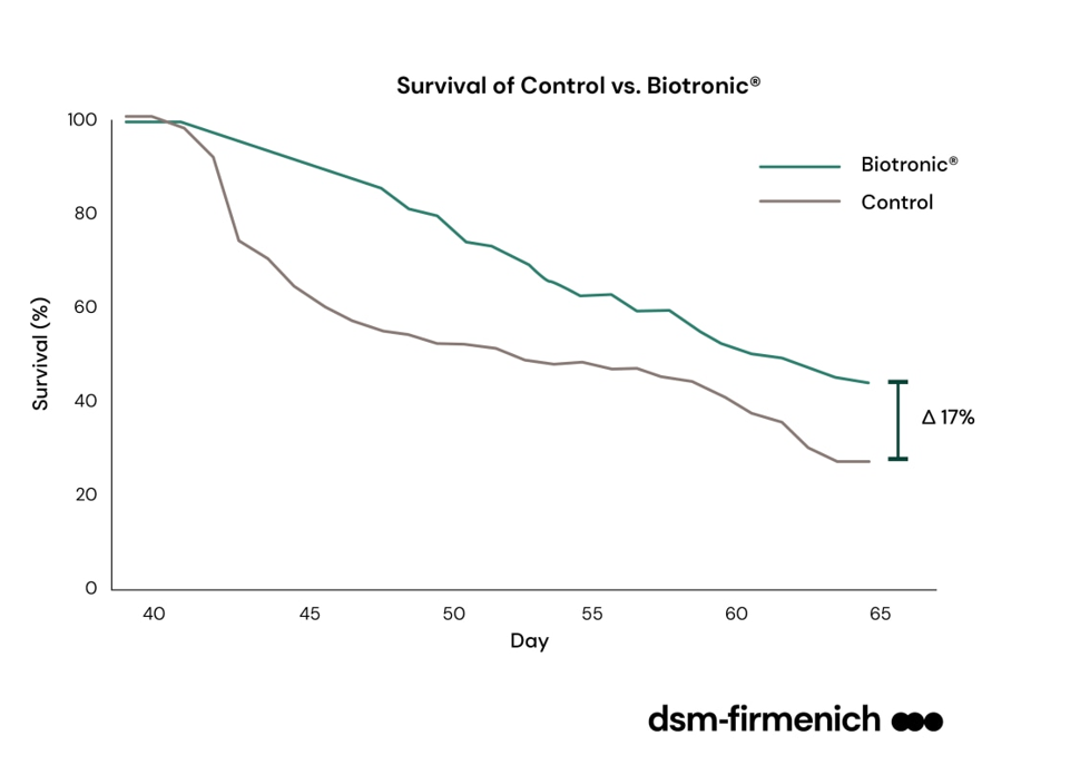 Şekil 3: 65 günlük bir SRS mücadelesinin ardından bir kontrol diyeti (D1) ile beslenen ve 2 kg / t'de Biotronic® Top3 ile desteklenen diyetle beslenen balıkların hayatta kalması.