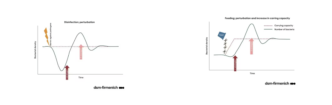 Antibiyotik kullanımı, dezenfeksiyon ve hatta besleme gibi yoğun su ürünleri yetiştiriciliği uygulamaları patojenik bakterilerin çoğalmasını destekleyebilir (Şekil 2). Bunun nedeni, birçok patojenin r-stratejisti olmasıdır, bu da özellikle rekabetçi olmayan ortamlarda yüksek büyüme oranlarına sahip oldukları ve istikrarsız koşullarda baskın olabilecekleri anlamına gelir. Tam tersine, birçok probiyotik de dahil olmak üzere K-stratejistleri daha yavaş büyür, ancak istikrarlı koşullarda baskındır. Bu durum, üretim döngüsü boyunca bir hastalık yönetim planının gerekli olduğu anlamına gelir. Yönetim planı da patojen sürveyansını ve salgınları önlemek için proaktif stratejileri veya antibiyotikler gibi reaktif önlemleri içermelidir.