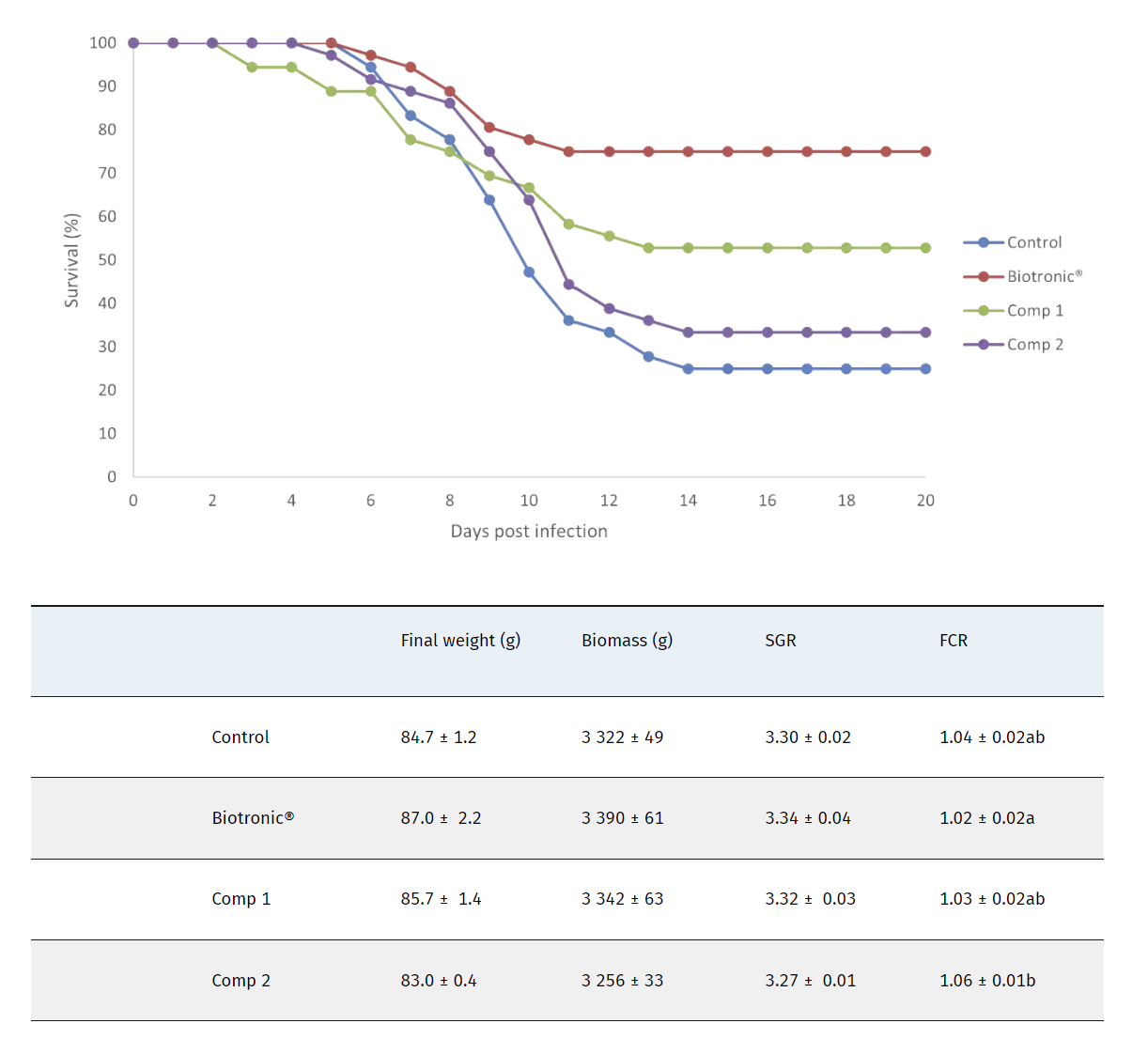 Şekil 4: 20 günlük bir A. hydrophila mücadelesinin ardından farklı diyetlerle beslenen balıkların hayatta kalması . Aşağıdaki tablo, denemenin sekiz haftalık büyüme aşamasındaki performans verilerini sunmaktadır.